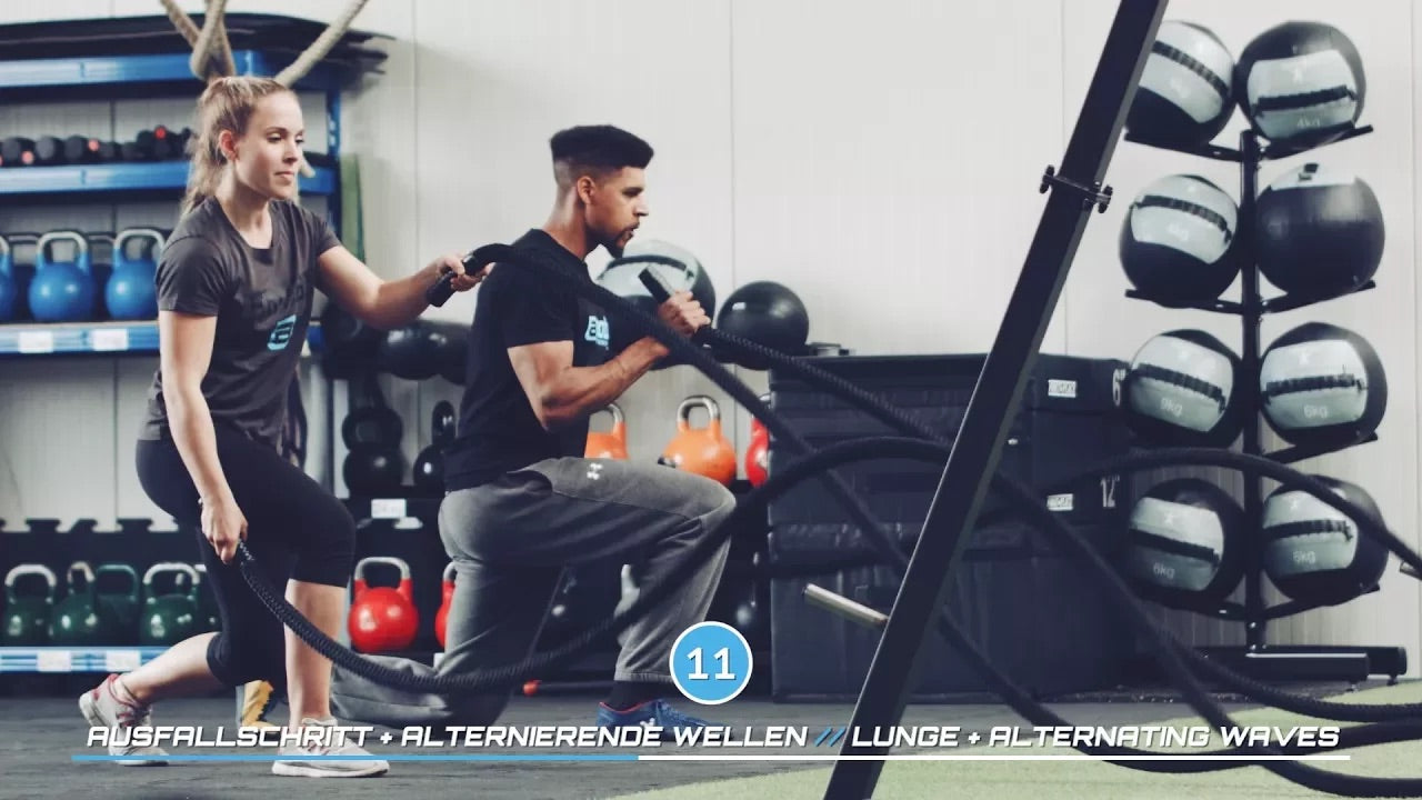 For the perfect introduction to Battle Rope training we have designed the following workout. Train in real-time along with our coaches. If you want to make it a bit more challenging, focus on Fabi who will show some exercises in a more advanced version. The exercises are consciously chosen because of their relativ simplicity so you can first get familiarized with this unique form of training with ropes.